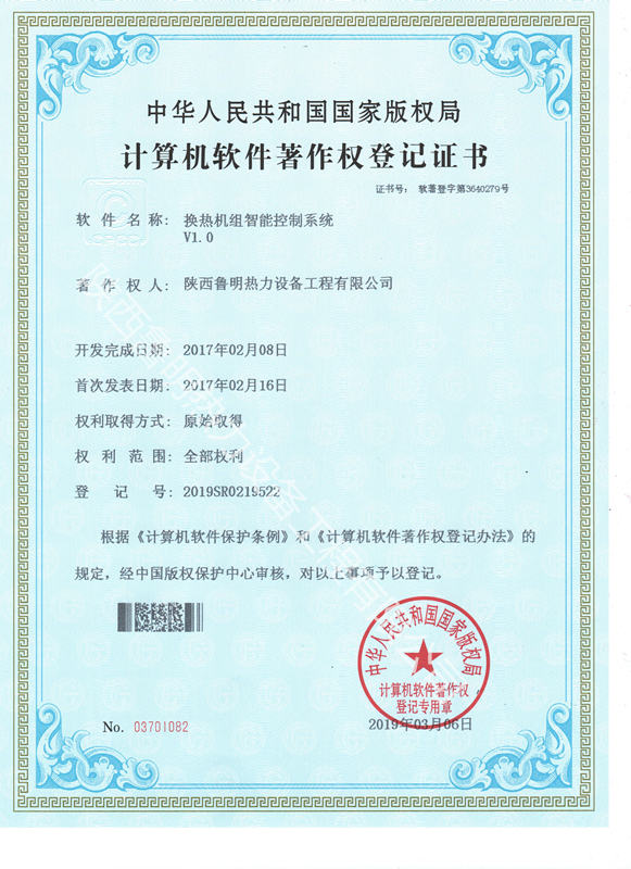 - 换热机组智能控制系统软件著作权登记证书
